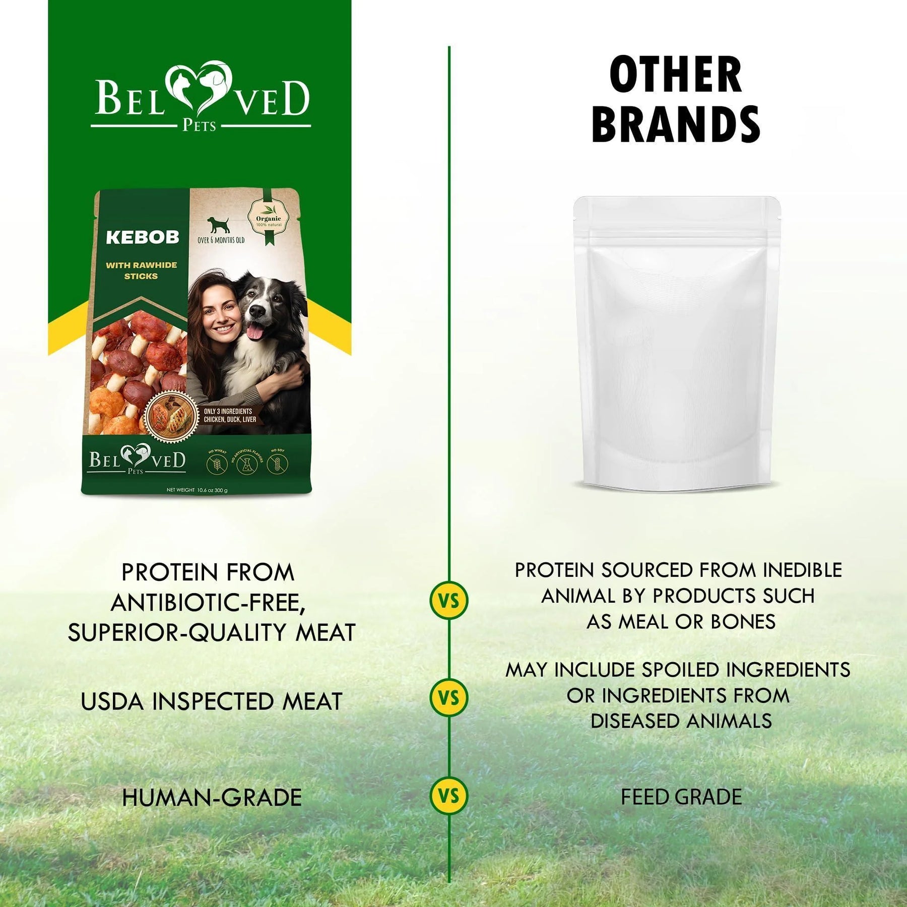 PREMIUM ORGANIC KABOB TREATS: Elevate your dog's snacking experience with our gourmet kebab treats, crafted from organic, human-grade ingredients. These rawhide sticks delights with duck, chicken liver are perfect for large and small breed dogs & puppies and aggressive chewers, providing a dental-friendly chew with every savory bite.